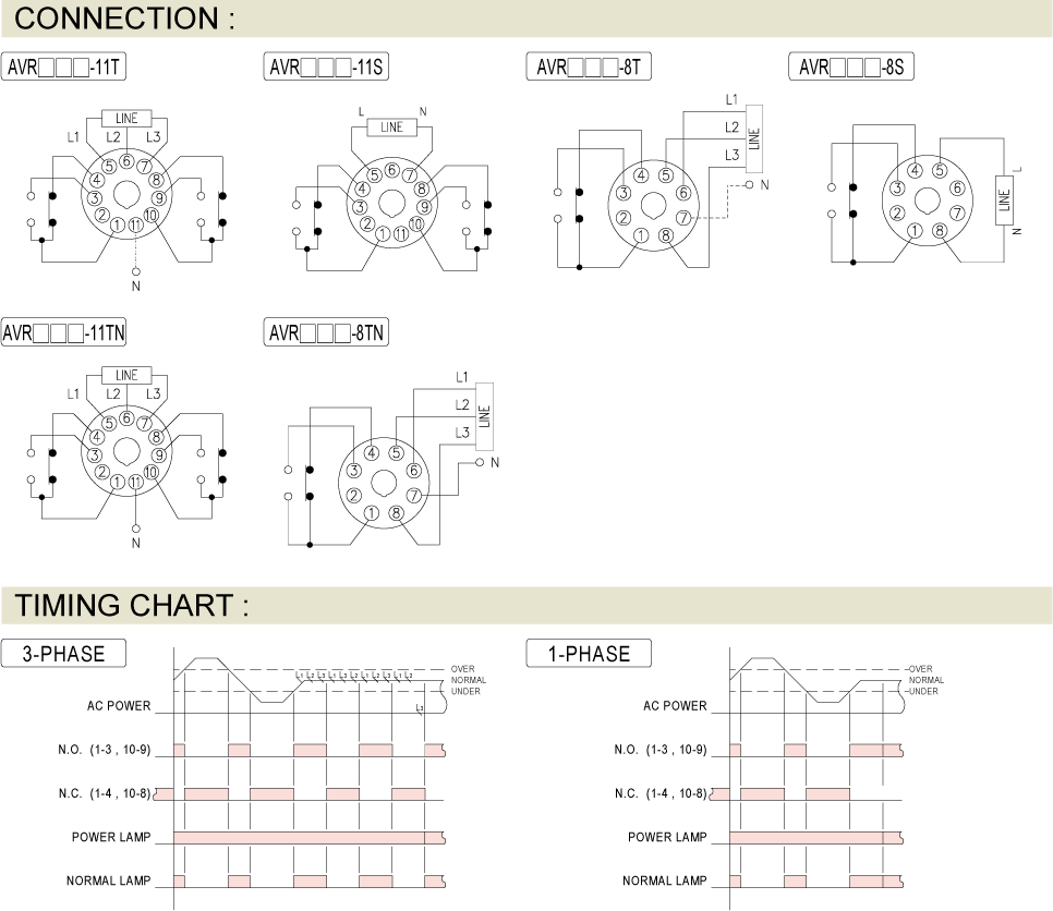Prev Next Protective Relay Voltage Relay AVR AC LINE VOLTAGE RELAY Add to inquiry Inquiry list Description Wiring and timing diagrams Overall dimensions or other Download 3-phase voltage and fault detector Can detect abnormal condition to prevent damages to the equipments Auto shut-off while detecting excessive or insufficient voltage, range from 5% to 20% variable Out-of-phase detection while the motor operating Can be set up to detect excessive or insufficient voltage only Delay and Reset time - 0~10sec adjustable tripping delay* CE certified Note: "*" indicates applicable to AVR172 series only AVR Catalogue AVR Users Manual