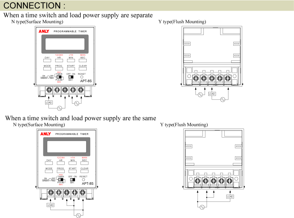 Prev Next Timer Programmable Timer APT-8S WEEKLY PROGRAMMABLE TIMER Add to inquiry Inquiry list Description Wiring and timing diagrams Overall dimensions or other Download Weekly programmable timer 8 different timing settings per day 15 different weekly combinations (See chart below) Built-in Lithium battery prevent power outage up to one year Crystal oscillator for extreme accuracy Up to 99 days holiday suspension Built-in Lithium battery prevent power outage up to one year Daylight-saving-time function Backlit LCD for easy viewing UL, C-UL recognized and CE certified APT-8S Catalogue APT-8S/APT-9S Users Manual