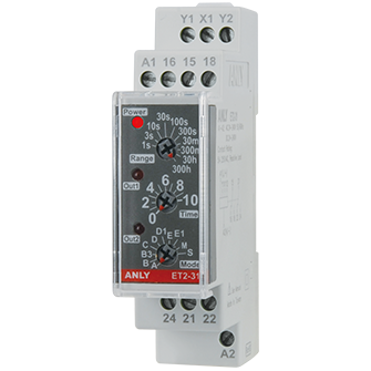 Prev Next Timer Analogue Timer ET2-31 MULTI-FUNCTION ANALOGUE TIMER Add to inquiry Inquiry list Description Wiring and timing diagrams Overall dimensions or other Download Wide operating voltage range in a single unit, AC/DC 24V~240V 10 field-selectable output modes for various applications 10 field-selectable time range, from 1 second to 300 hour Includes 2 SPDT output contacts 22.5 mm thin body design X1, Y1, Y2 contact for mode control ET2-31 Catalogue ET2-31 Users Manual