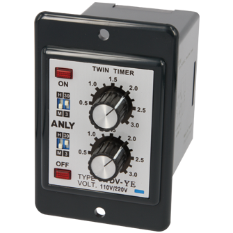 Prev Timer Analogue Timer ATDV TWIN ANALOGUE TIMER Add to inquiry Inquiry list Description Wiring and timing diagrams Overall dimensions or other Download Customized CMOS IC for low power consumption, high operation stability and extreme timing accuracy Independent adjustment for continuous ON-OFF operation and time 16 different time ranges available 2 operating voltage in a single unit, AC110V and 220V 5(A, B, C, D, E) timing series available* Each timing series has 4 time ranges, selectable via DIP switch* CE certified Note: "*" indicates applicable to ATDV multi range series only ATDV Catalogue