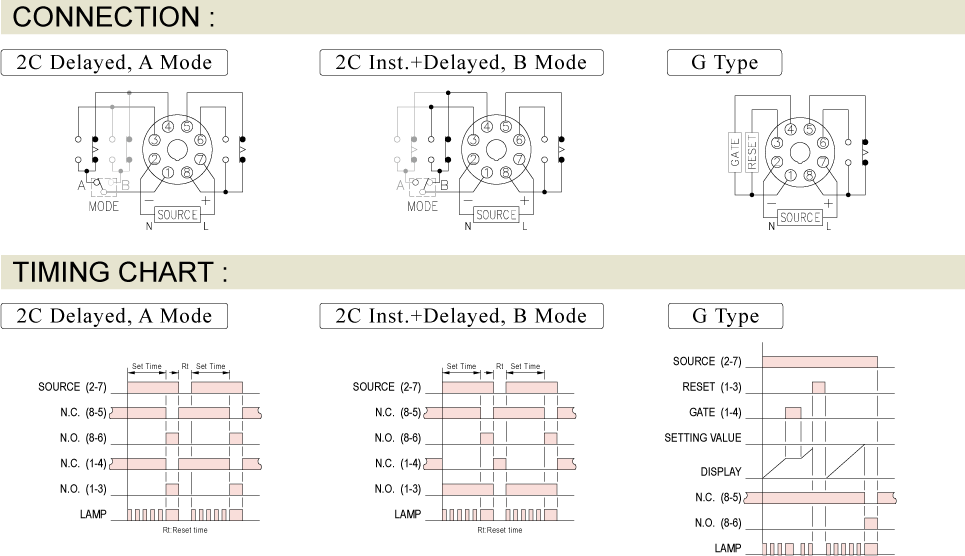 2 modes selectable via a slide switch: Mode A (2C) for DPDT time-limiting