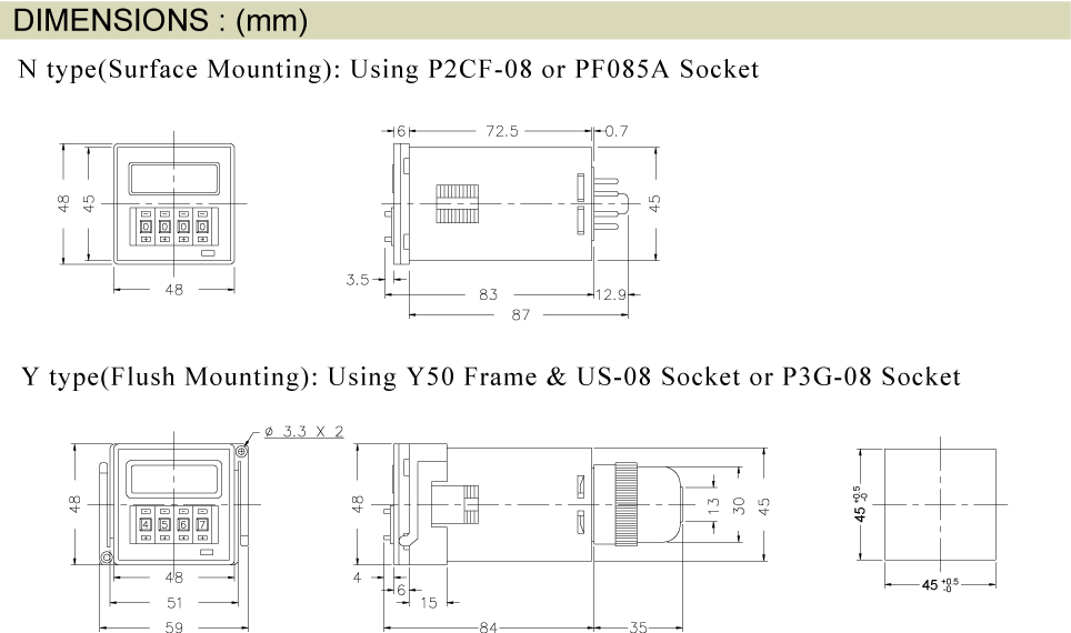Prev Next Timer Digital Timer AH5E DIGITAL TIMER Add to inquiry Inquiry list Description Wiring and timing diagrams Overall dimensions or other Download 7-segment-display for clear display and effective monitoring Protection against power surge and high frequency interference Base-10 (99.99S~99990H) and Base-60 (99M59S or 99H59M) time ranges available Available on Count Up model or Count Down model AH5E Catalogue